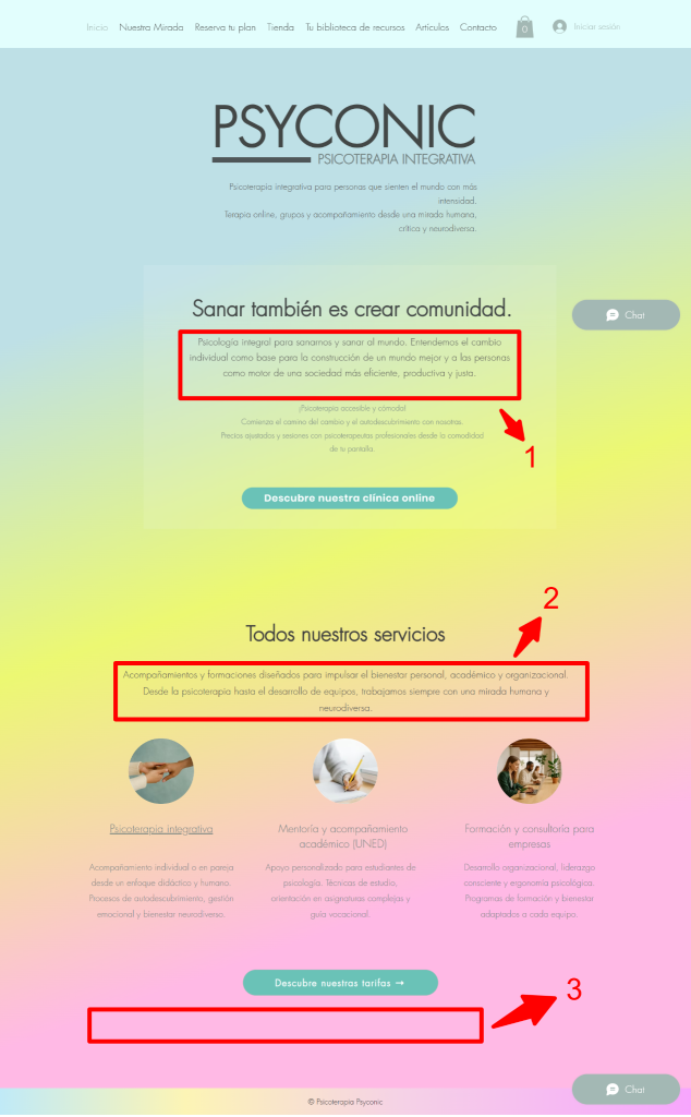 A continuación, se determinan las áreas a intervenir por secciones enumeradas. Ten en cuenta que las instrucciones están después de la imagen, así como los textos sugeridos para tu sitio Web.