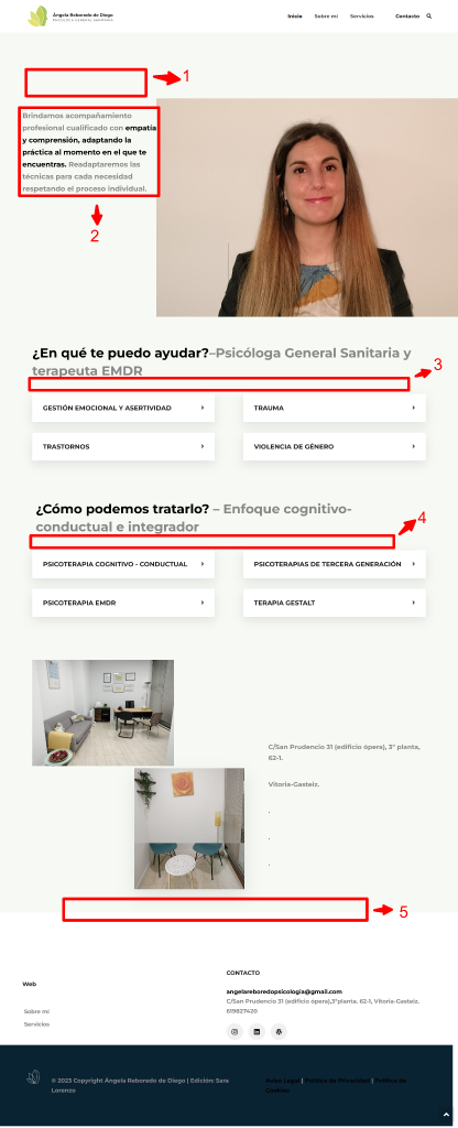 A continuación, se determinan las áreas a intervenir por secciones enumeradas. Ten en cuenta que las instrucciones están después de la imagen, así como los textos sugeridos para tu sitio Web.