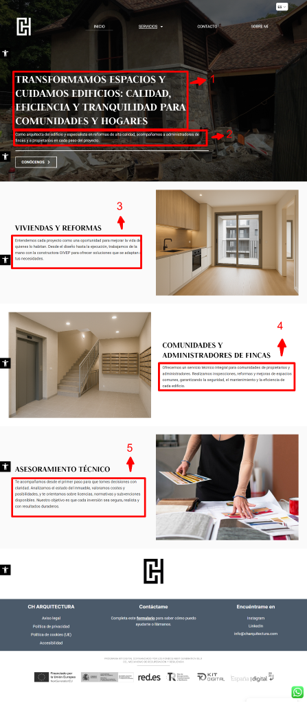 A continuación, se determinan las áreas a intervenir por secciones enumeradas. Ten en cuenta que las instrucciones están después de la imagen, así como los textos sugeridos para tu sitio Web.