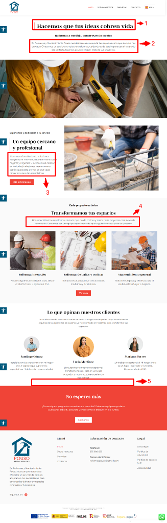 A continuación, se determinan las áreas a intervenir por secciones enumeradas. Ten en cuenta que las instrucciones están después de la imagen, así como los textos sugeridos para tu sitio Web.