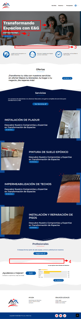 A continuación, se determinan las áreas a intervenir por secciones enumeradas. Ten en cuenta que las instrucciones están después de la imagen, así como los textos sugeridos para tu sitio Web.