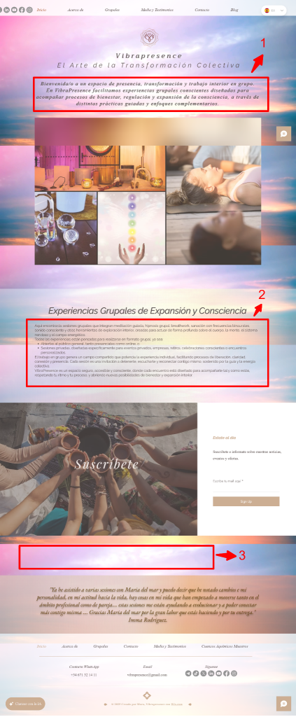 A continuación, se determinan las áreas a intervenir por secciones enumeradas. Ten en cuenta que las instrucciones están después de la imagen, así como los textos sugeridos para tu sitio Web.