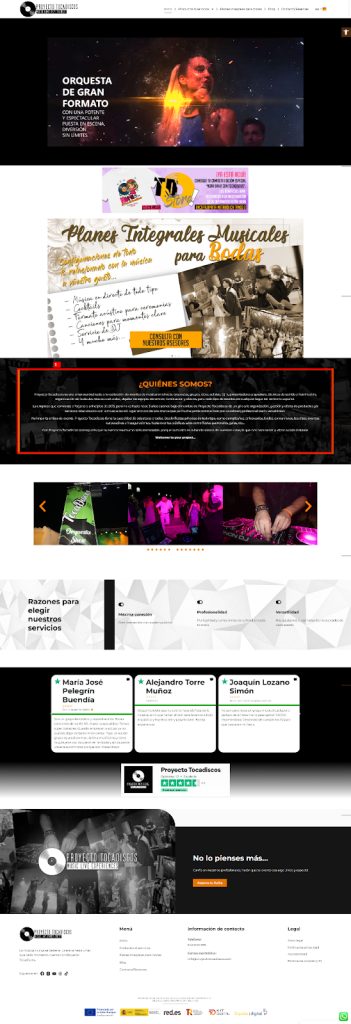Proyecto Tocadiscos es una empresa de eventos dedicada a la realización de todo tipo de celebraciones musicales en directo en cualquier punto del territorio español. Su actividad abarca la organización de eventos públicos y privados, combinando orquestas, grupos, dúos, solistas y servicios de DJ, adaptados a las necesidades de cada ocasión.