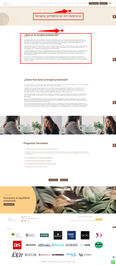 Párrafo: Accede a terapia psicológica en Valencia para mejorar tu salud emocional. Un espacio seguro donde trabajamos tus necesidades personales con cercanía, empatía y orientación profesional efectiva.