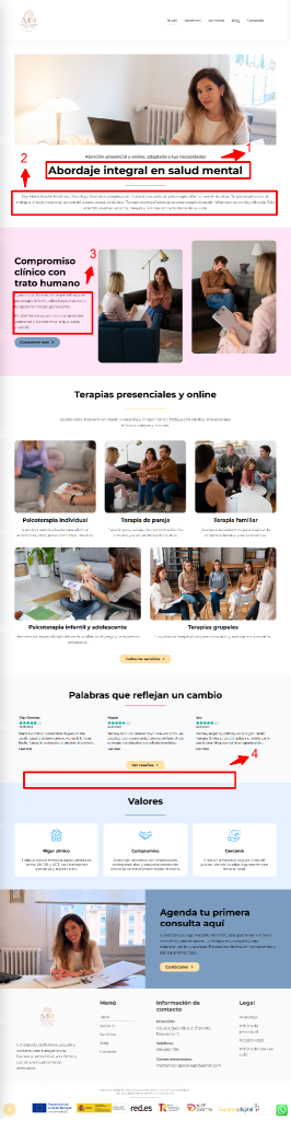 A continuación, se determinan las áreas a intervenir por secciones enumeradas. Ten en cuenta que las instrucciones están después de la imagen, así como los textos sugeridos para tu sitio Web.