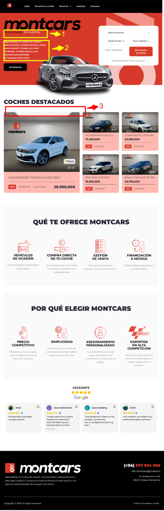 Mantener estructura jerárquica correcta (H2 en “Coches Destacados”, “Qué te ofrece Montcars”, etc.).