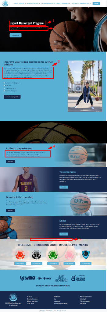 A continuación, se determinan las áreas a intervenir por secciones enumeradas. Ten en cuenta que las instrucciones están después de la imagen, así como los textos sugeridos para tu sitio Web.